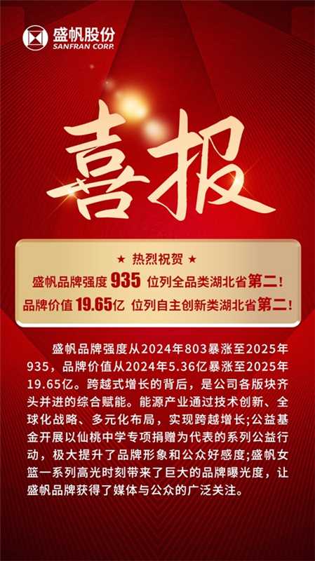 评价结果显示,武汉盛帆电子股份有限公司(以下简称“盛帆股份”)凭借稳健的经营实力、突出的创新能力与良好的品牌口碑,交出了一份亮眼答卷:品牌强度达935,品牌价值飙升至19.65亿元,较往年实现跨越式增长,创历史新高!