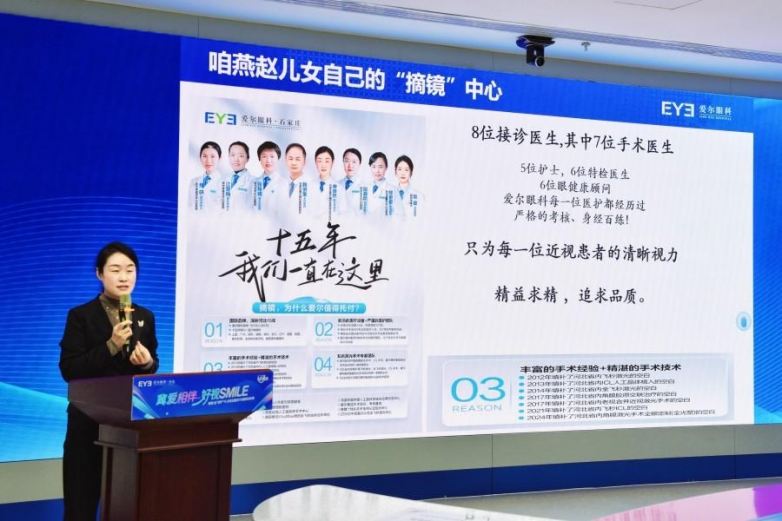 近日,由爱尔眼科河北省区联合蔡司主办的“冀爱相伴·好视SMILE——微创全飞秒™4.0河北11城联动庆典”石家庄站,在石家庄广电融媒体中心顺利落下帷幕。作为爱尔眼科河北省区聚焦屈光手术的年度庆典活动,现场以前沿技术微创全飞秒™4.0科普、专家一对一答疑为核心,吸引包括高三学生、大学生、白领等在内的超50位近视人群到场参与。