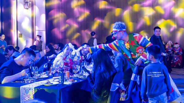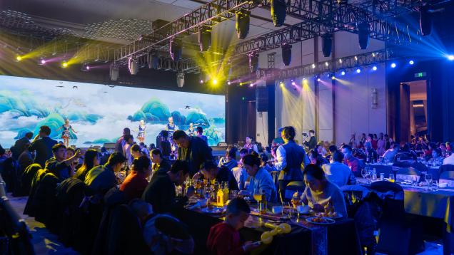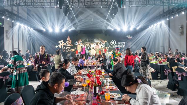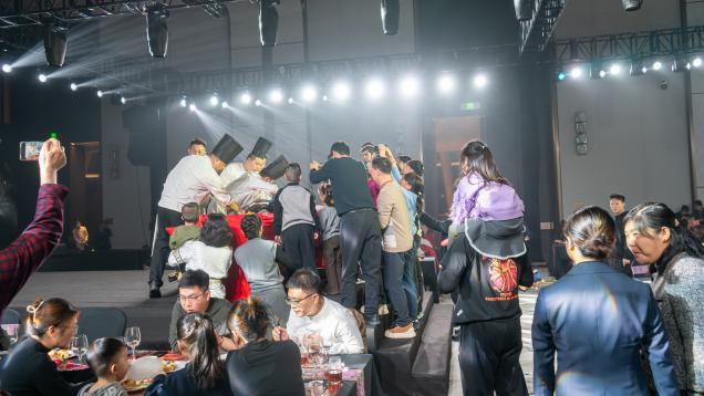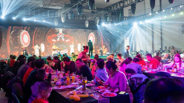 晚宴环节尤为精彩,酒店餐饮团队精心打造“九州筵席·烟火人间”主题豪华自助。食材精选各民族特色风味,融合民族餐饮文化,呈现出一道道兼具视觉与味觉享受的精致菜品。西班牙蓝旗金枪鱼开鱼仪式更是让用餐仪式拉满。宾客在品尝美食的同时,也可欣赏到多元表演——民族歌舞、马头琴演奏、民乐电音交替上演,抽奖环节跌宕起伏,最终现场来宾共舞一曲台湾省高山族《拉手舞》将晚宴氛围推向高潮。