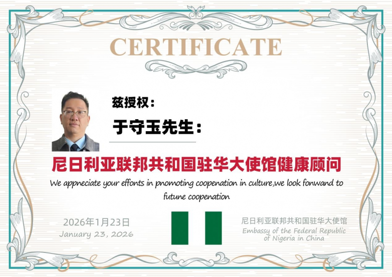 授聘仪式上,尼日利亚驻华大使馆代表对于守玉教授的中西医结合诊疗体系给予高度评价,他表示,尼日利亚始终重视传统医学与现代医学的融合发展,中医药作为中华优秀传统文化的瑰宝,其 “治未病” 的健康理念与整体调理的诊疗思路,与尼日利亚本土传统医学的核心思想高度契合。此次聘请于守玉教授担任中医健康顾问,正是希望借助其专业的中医诊疗能力,为使馆工作人员及家属提供专业的中医健康指导,同时也为中尼两国中医药文化的交流搭建新的桥梁,让更多尼日利亚民众了解、认识并受益于中医药的独特智慧。