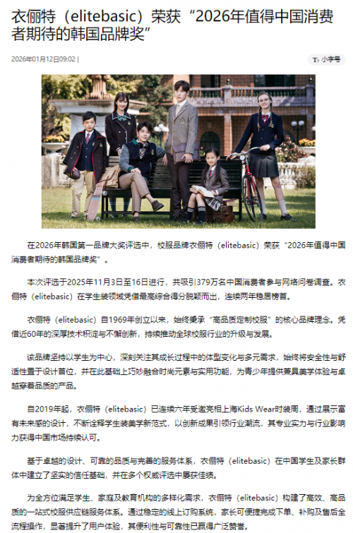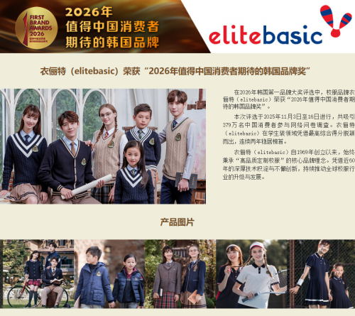 近日备受关注的「2026年韩国第一品牌大奖」颁奖典礼在韩国首尔隆重举行国际高端校服品牌衣俪特(elitebasic)凭借近60年的品牌积淀、卓越的产品品质以及在...