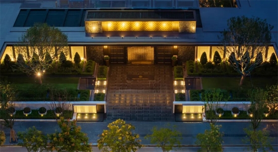 项目采用瑰丽酒店风格设计,打造了约88米宽的瑰丽门庭和500平方米的环岛式落客车马院,形成人行加车行双酒店式归家礼序。80年树龄的朴树静静矗立,高门大户的恢弘气度扑面而来。