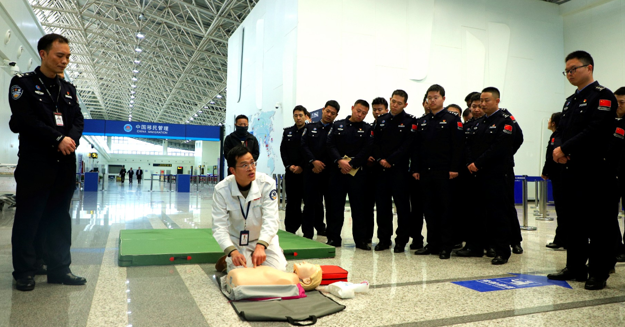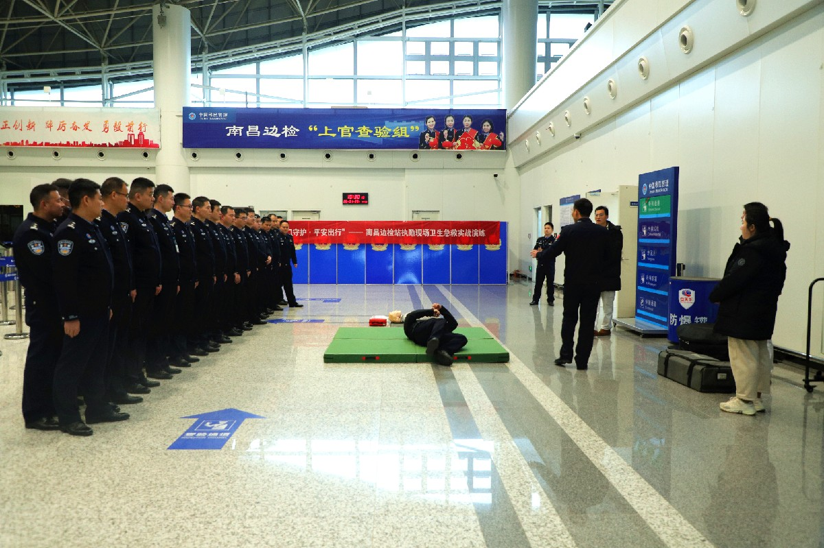 在昌北国际机场T1航站楼,南昌出入境边防检查站的民警们不仅是守护国门安全的忠诚卫士,如今也正努力成为旅客生命安全的“第一响应人”。1月29日,南昌边检站在执勤现场开展“国门守护·平安出行”卫生急救实战演练,民警们化身“学员”,在专业医疗人员的指导下,学习如何与时间赛跑,为生命护航。