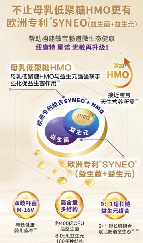 真正的高端配方,源于对宝宝生理需求的深度洞察。纽康特星诺是市面上唯一融合SYNEO益生元/益生菌和氨基酸的无敏配方,助力食物过敏宝宝构建健康肠道微生态,护航免疫系统稳步发育。其中,含量超400倍母源有益菌的M-16V,搭配拥有百余种结构的自护益生元,再融合母乳中第三大活性营养HMO,三者协同作用,高效修复敏宝受损的肠道屏障,筑牢抵御敏感的内在防线。而9:1黄金比例的短长链益生元组合,更以百余种结构激活肠道全域活力,让营养吸收更高效,肠道环境更稳定,全方位守护宝宝健康成长。