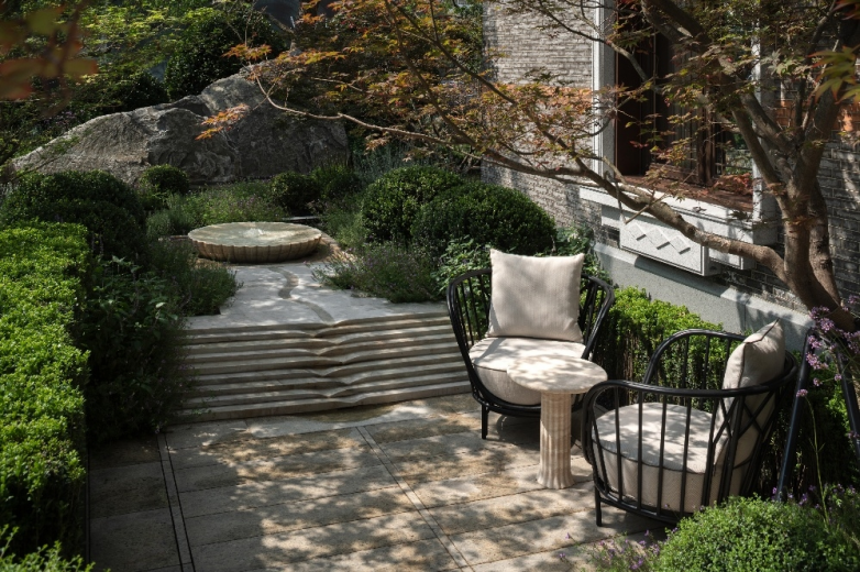 在这里,文化典故历久弥新:士林·润园将隐逸于历史中的人文雅事、坊间佳话融入景观体系,凝练为承载着丰富文化记忆的“润园八景”:“海上花”灵感源于晚清吴语小说《海上花列传》;“申之华”化用经典“一池三山”布局,以现代极简石组水景,营造都市仙境哲思;“云间诗”借廊架与诗文瀑布,致敬云间诗派文脉;“拄颊映”精选特型枣树与精工廊架,隐喻董其昌“拄颊对西山”的雅集胜境;“文开园”则从胡开文墨庄汲取灵感,将墨色与墨韵镌刻于山石之上,诉说海派文化的源流。
