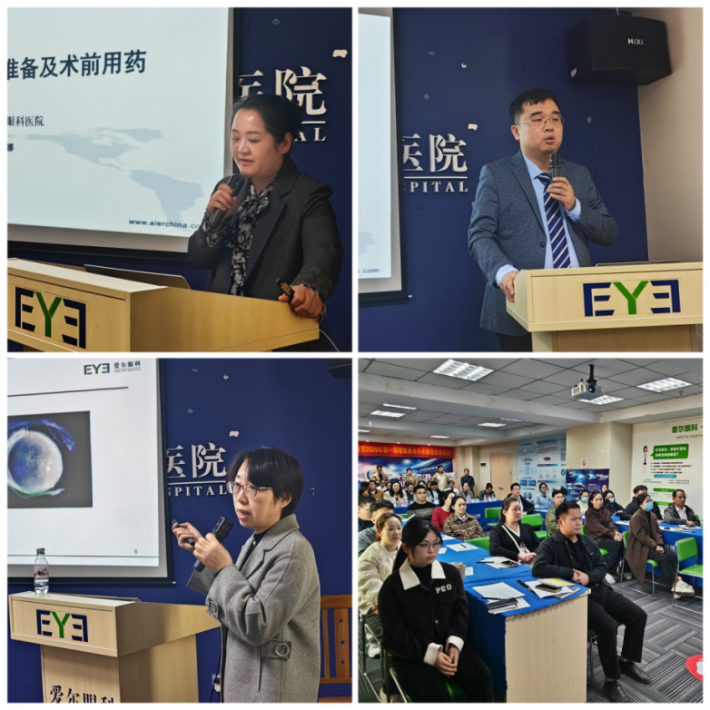 南宁爱尔眼科医院角膜眼表科副主任尹瑰娜就《适应症选择、术前必查项、术前准备及围手术期用药》进行系统讲解,明确手术筛选标准与标准化流程。防城港爱尔眼科医院副院长吕芳奇就《三联翼状胬肉手术操作及步骤》系统讲解改良Perfect三联手术的核心技术与操作要领。南宁爱尔眼科医院角膜眼表科副主任申海静则聚焦术后管理,讲授《翼状胬肉术后上皮持续缺损的原因与治疗》。