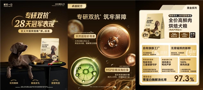 发展至今,诚实一口已拥有非常丰富的产品矩阵,猫线产品如P40 Plus、BK01 Plus、奇迹小金袋、黑金高鲜肉烘焙粮,狗线产品如N33 Plus、BN01等,覆盖多元需求。2025年,诚实一口迎来重大升级,首先正式官宣自有工厂启鲜,随后接连推出黑金烘焙猫粮和狗粮两大年度新品,持续引领高端宠粮市场创新。