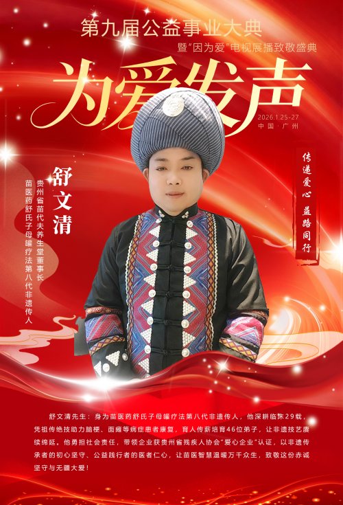 从苗医传承的“守艺人”,到公益践行的“暖心人”,29年来,舒文清以苗医药为纽带,将专业深耕与公益奉献深度融合。他以赤诚为笔、以坚守为墨,既延续着苗医药的千年薪火,也在公益之路上书写着“责任与担当”的时代答卷,成为兼具专业实力与社会温度的新时代典范——正如他在公益大典中展现的那样,“仁心践苗医,大爱担使命”,从来不是一句口号,而是刻在日常里的选择与坚持。