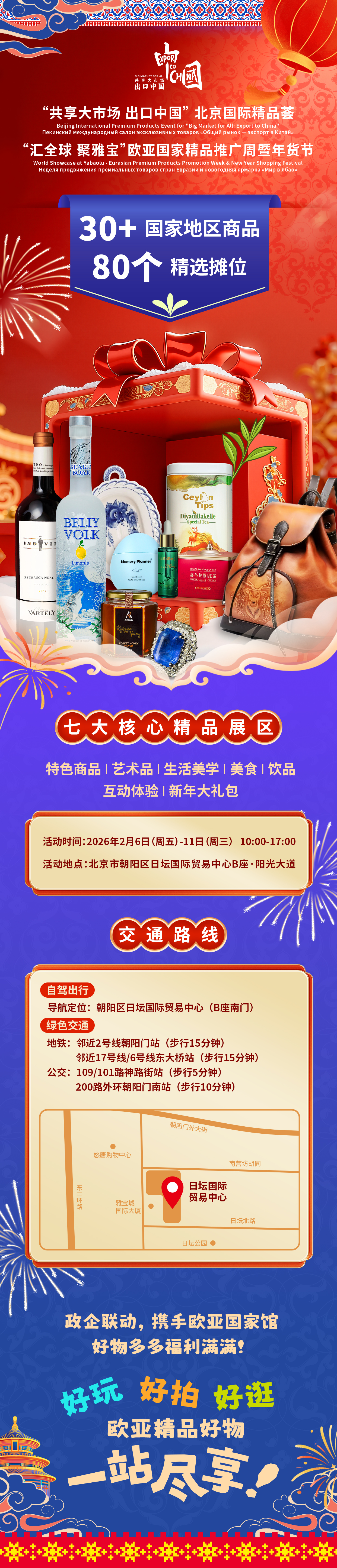 年味渐浓,采购、送礼清单该更新啦!备受期待的“共享大市场 出口中国”北京国际精品荟——“汇全球 聚雅宝”欧亚国家精品推广周暨年货节,将于2026年2月6日至11日在北京朝阳区日坛国际贸易中心阳光大道举办。活动汇聚来自30个欧亚国家及地区的特色商品,配备了专业的购物服务,还设置了丰富的互动体验活动,在北京朝阳就能一站式跨享欧亚精品,为新春佳节增添多元文化氛围。