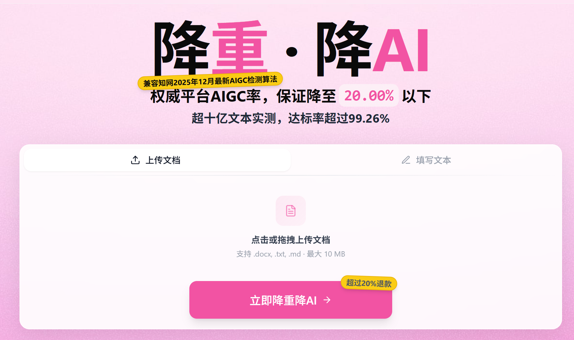 就是这个嘎嘎降ai,网站挺干净,没广告,看着还行。它的核心功能就是针对知网AI率进行优化。