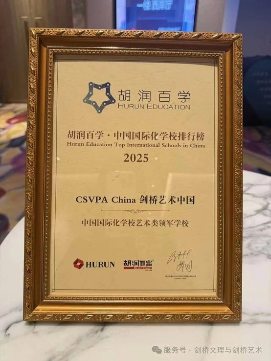 凭借在国际艺术教育领域的卓越表现、亮眼的升学成果及深厚的学术积淀,剑桥艺术中国(CSVPA China)在数百所学校中脱颖而出,第三次获得2025胡润百学《中国国际化学校艺术类领军学校》。这不仅是行业对我们过去成绩的肯定,更是对每一位学子艺术梦想的有力加持。