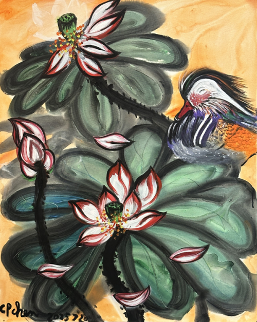 在表现形式上,陈持平的丙烯画堪称动态之美的极致诠释。在作品《半壕春水一城花》中,繁花的绽放通过色块的堆叠与晕染呈现出蓬勃张力,仿佛能看见花瓣在风中摇曳、春水在阳光下闪烁。作品《晴空一鹤排云上》则尽显豪迈之气,厚重的底色衬托出飞鹤的矫健身姿。这份难得的动态之美,源于陈持平对生活细节的敏锐洞察,更源于他对生命活力的深刻体悟。陈持平的艺术风格兼具豪放与婉约,他将自然万物的运动轨迹、内在节奏,转化为画面中的线条流转与色彩铺陈,让静态的画布成为动态生命的永恒定格。