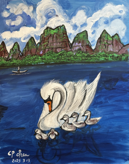 在陈持平的丙烯画作品中,色彩的晕染与线条的游走,常常带着书法书写的节奏感,让画面充满了呼吸感与生命力。作品《望江南》以柔和却不失灵动的色彩,勾勒出江南水乡的温婉意境。作品《我是天空里的一片云》则将自由洒脱的气质推向极致,色彩时而浓烈时而淡雅,恰如云朵在天空中自在舒展,充满浪漫主义情怀。