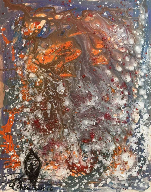 陈持平经过多年的艺术实践,终是达成了绘画与书法的深度共生,构筑起书绘相融、形神合一的艺术格局。在他的作品中,绘画的色彩张力与书法的笔墨精神相互成就、相得益彰,形成了兼具传统韵味与当代气息的艺术风格。他的丙烯画作品如同一团燃烧的火焰,既照亮了传统艺术的当代价值,也展现了当代艺术家突破束缚、追求自由表达的精神情怀。