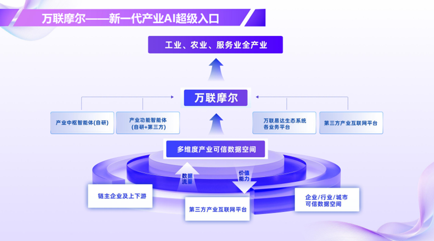 “万联易达天然的产业基因,百亿量级的结构化产业可信数据,以及遍布全国的区域网络,融通贸易、物流、金融及生产性服务业的全链条服务能力,都为实现打造全产业智能体超级应用市场创造了有利条件。”