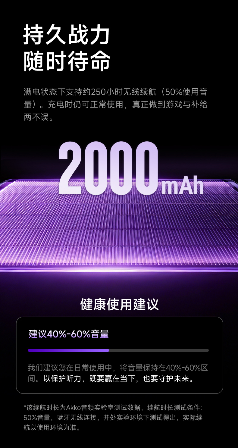 内置大容量电池,在2.4G无线模式下可提供长达约250小时的超长续航,并支持边充边用,彻底告别电量焦虑。