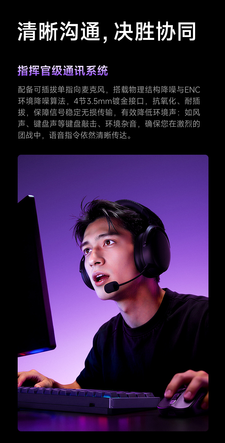 耳机配备可插拔高灵敏度指向性麦克风,结合物理结构与ENC环境降噪算法,能有效抑制背景噪音,保障团队沟通清晰顺畅。