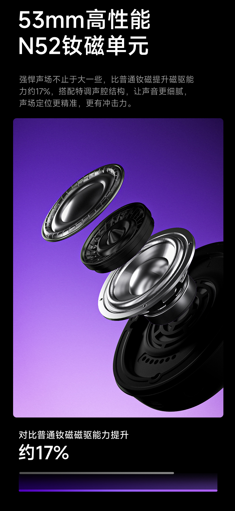 破晓S9 Ultra的核心竞争力源于其专业的声学架构。耳机搭载了53mm高性能N52钕磁驱动单元,磁驱动力显著提升,结合经过特殊调校的声学腔体,不仅提供了更强劲的动态响应,更实现了极其精准的声音定位与富有层次的空间感还原,让游戏中的每一处细节声响都无所遁形。
