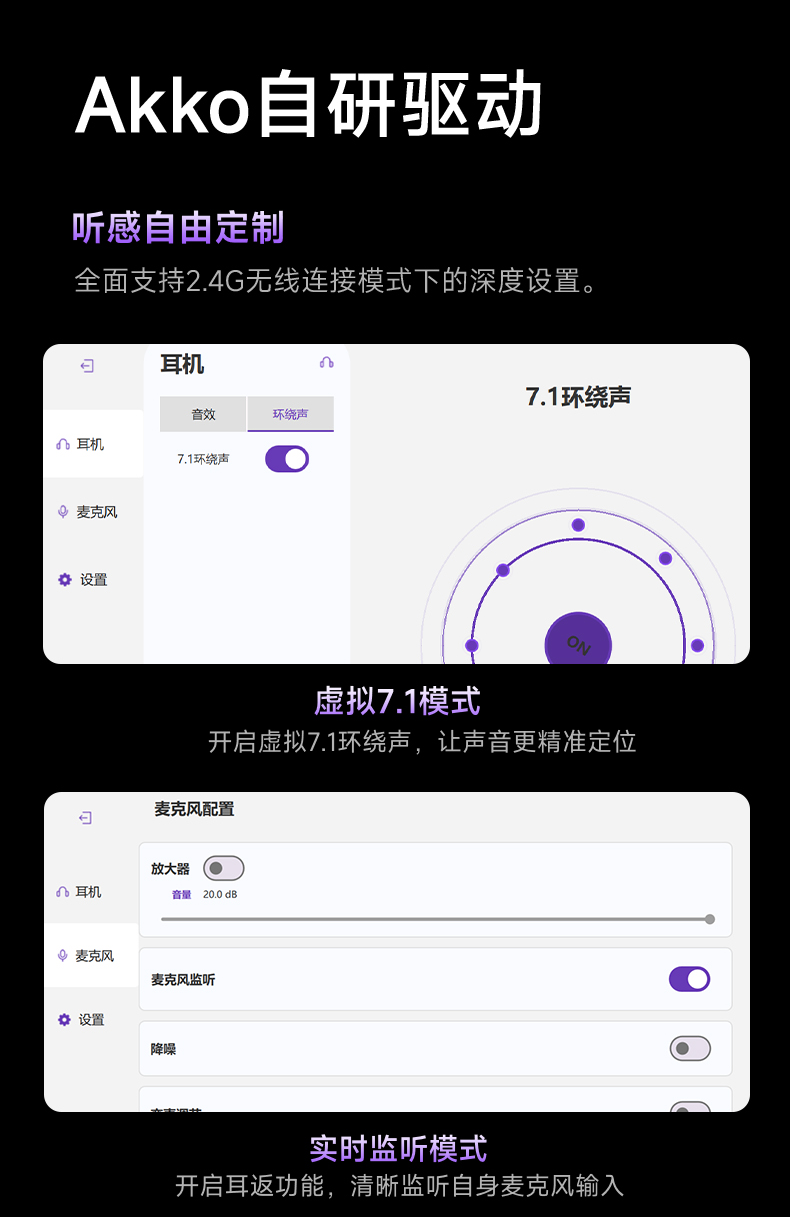 此外,用户可通过Akko自研驱动软件,对耳机的EQ均衡器、麦克风降噪、节能模式等功能进行个性化设置,并支持监听功能,打造专属的音频方案。