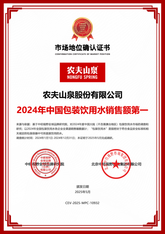 农夫山泉在2024年能够蝉联中国包装饮用水市场销售额第一,是其综合实力的必然体现。这背后,是优质水源构筑的坚实壁垒,是“水+饮”双轮驱动的战略智慧,是持续不断的产品与技术创新,是深入骨髓的可持续发展理念,以及面对风浪时展现出的强大品牌韧性和危机应对能力。这份认证,不仅记录了过去一年的成绩,更预示着其在行业格局重塑与消费变迁的浪潮中,已然具备了行稳致远的深厚底蕴与开阔视野。未来的农夫山泉,在巩固国内基本盘的同时,其国际化的探索之路将如何书写,无疑值得市场持续期待。