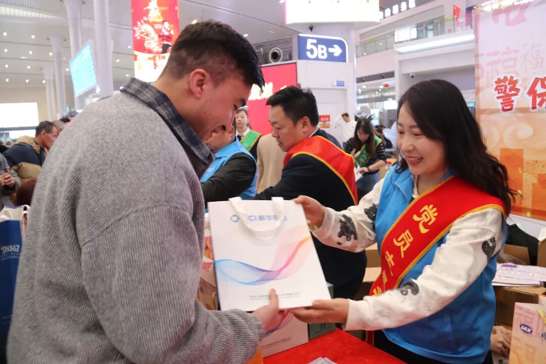 在乌鲁木齐站护航点,志愿者们热情地向过往旅客发放新春礼包、食品饮品、急救包、腰靠、暖手宝、便携水杯等实用物资,并送上春联、吉祥玩偶等新春祝福礼品。现场还设置了金融保险知识普及环节,志愿者们围绕金融保险常识、非法金融活动识别技巧等内容进行宣讲,以耐心细致的解答回应群众关切,用专业知识为春运归途保驾护航。