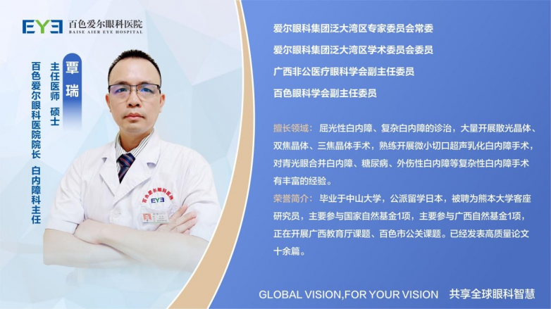 覃瑞院长毕业于中山大学,曾赴国内顶尖眼科中心进修白内障超声乳化技术,累计完成白内障手术超万例,擅长各类复杂白内障(如并发性白内障、高度近视合并白内障、糖尿病性白内障等)的诊治,尤其对“个性化屈光性白内障手术”经验丰富。