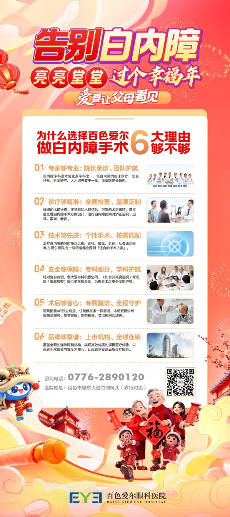 平时忙碌,陪伴不易。别让白内障模糊了父母眼中的团圆美好,别让等待成为明天的遗憾。带他们来百色爱尔眼科医院,在覃瑞院长与专业团队的守护下,重获清晰视力——让他们看清你眼中深深的关怀。