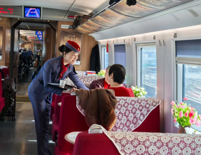 当日,D2642次列车平稳运行途中,列车长海亚婷在例行巡视车厢时发现,一位老年旅客和家人因购票分散的原因与同行家人被安排在不同车厢,老人行动不便、听力不佳,独自乘车十分不便,同行家属也焦急万分,多次在车厢间往返照看,十分辛苦。了解到这一特殊情况后,列车长第一时间安抚老人及家属情绪,主动协调列车餐车区域,为老人和家人安排了一处安静舒适的座位,让其得以全程相伴、安心乘车。