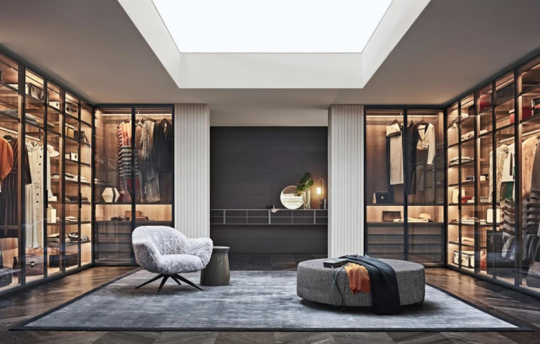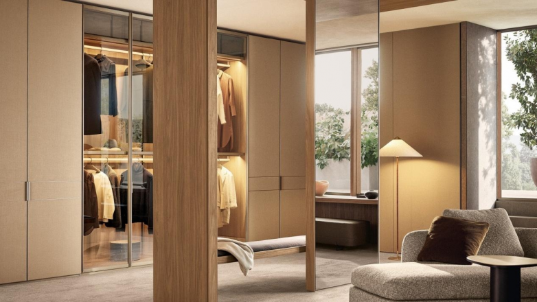 Senzafine(意大利语意为“无尽”)是Poliform最负盛名的衣帽间系统,其核心竞争力在于通过标准化的模块实现高度定制化的视觉效果。