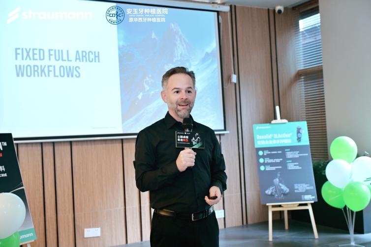 仪式之后,Dr. Christian Jarry以《Straumann Pro Arch Solution and its advantage in traditional and digital flow》为题,系统阐述了士卓曼在全口重建解决方案中的产品逻辑与临床适配路径。他从种植体、基台到辅助组件,层层解析数字化与传统流程如何协同增效、互为支撑。
