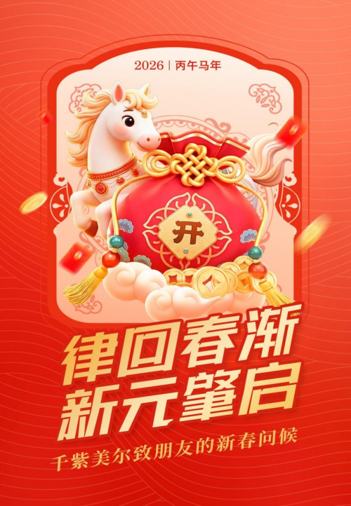 律回春渐,新元肇启。当街头的红灯笼缀满枝头,当归家的步履踏响归途,新年的暖意便浸润了世间每一个角落,承载着过往的沉淀,也孕育着崭新的期许。值此辞旧迎新之际,千紫美尔谨向长期以来信任、支持我们的每一位朋友,致以诚挚的新春问候与美好的节日祝福。