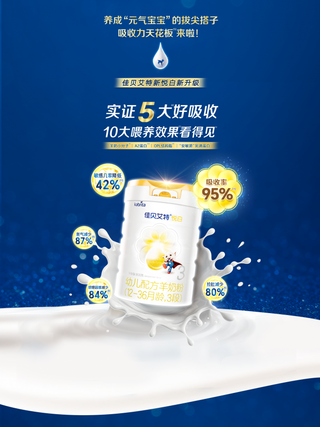 佳贝艾特悦白羊奶粉的升级不是单一的添加OPL结构脂,更在于将这一成分与羊奶的天然优势相结合。羊奶本身脂肪球颗粒小,加上天然A2蛋白,与OPL结构脂共同作用,使奶粉的整体吸收率显著提升可达近95%。多重优势的叠加为婴幼儿提供了更易消化、更好吸收的营养选择。