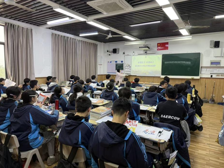 在瑞安塘下中学,宣讲团以班级为单位开展精准宣讲,通过发放宣传资料、展示主题海报、面对面深度交流等形式,向在场学生及家长全面介绍浙江财经大学东方学院的办学概况、专业设置、人才培养与校园生活。团队成员结合自身经历,细致分享高中阶段高效学习方法与高考备考经验,为学弟学妹们提升学习效率、从容应对高考提供了实用参考。