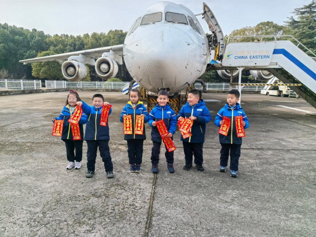 课程尾声,孩子们手持春联与福字,与帅气的机长叔叔合影留念,镜头定格下好奇与崇敬交织的稚嫩脸庞。