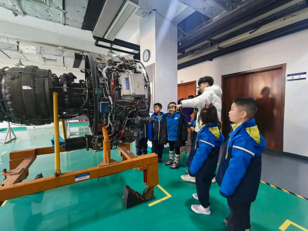 紧接着,孩子们转场至机务培训区域。机务工程师以一台飞机发动机为教材,开始了生动的讲解。“大家看,这几排叶片的旋转,能吸入相当于一个房间体积的空气;而燃烧室的温度,可以熔化大多数金属。”工程师用孩子们能理解的语言,揭开了这颗“飞机心脏”的力量奥秘。孩子们睁大眼睛,看着那些精密交错的叶片与管道,第一次直观感受到,那托举上百吨钢铁冲上云霄的,是何等精妙而可靠的力量。