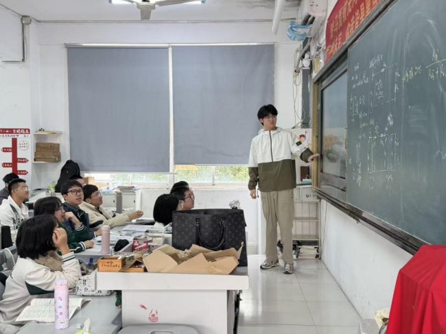 宣讲现场,队员龚子铭介绍中国矿业大学办学情况,讲解人工智能、智能制造工程等优势学科建设情况、人才培养模式及学校科研实力。队员林毓彤结合个人在校学习生活经历,介绍学校科研平台、校园活动及育人环境。队员周宇翔分享高考复习方法,解读矿大招生政策与志愿填报相关内容。此次宣讲共发放宣传手册80余份,覆盖3个班级130余名学生。