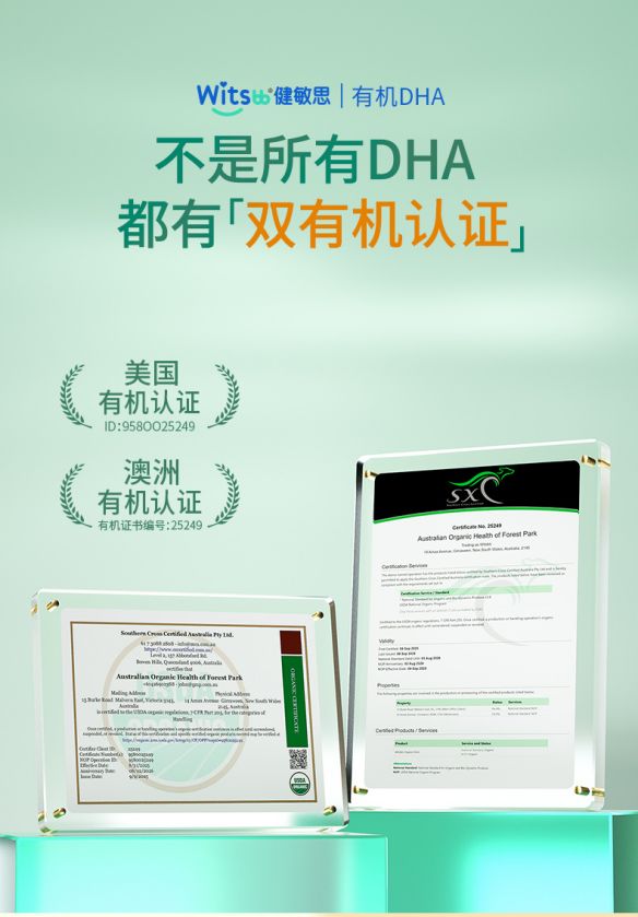 双有机DHA同时获得美国农业部有机与澳大利亚有机双重认证,并通过澳洲TGA(澳大利亚药品管理局)认证,形成多重标准叠加的安全背书。这种双有机路径,不仅回应了市场对高品质DHA的需求,也进一步夯实了Witsbb健敏思“无敏”理念在实际产品中的落地能力。