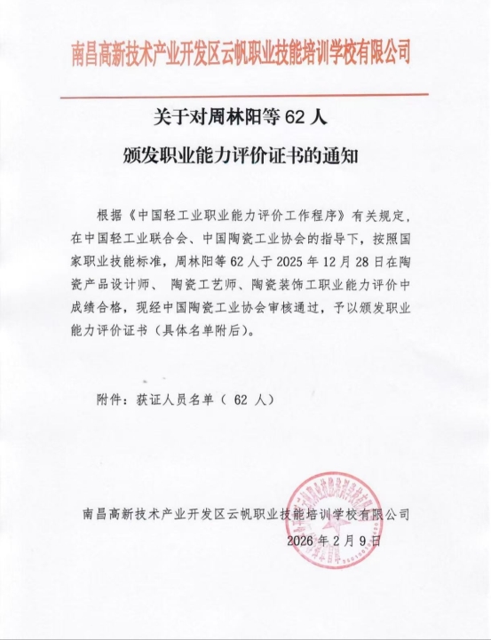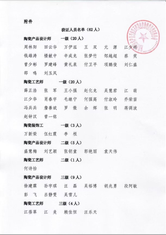喜 报景德镇报名处负责人:汪则成 监督人:范俊强地址:中国陶瓷城香江东路一街33号获证人员名单(62人)陶瓷产品设计师 一级(20人)周林阳 田云华 万伊泓 王...