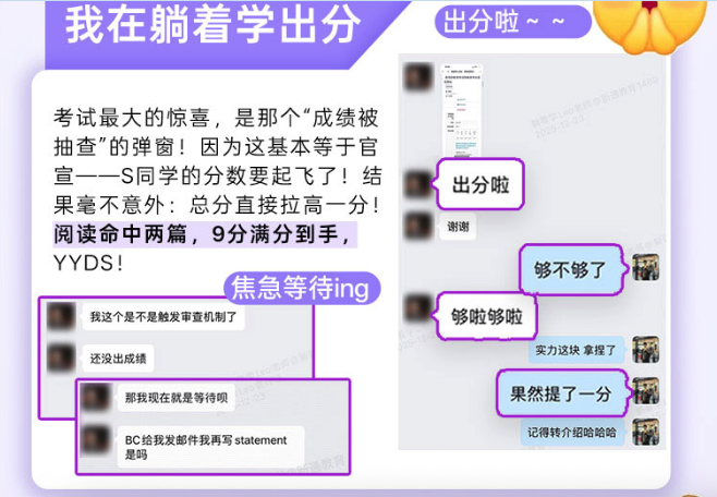 “口语之前报过线下班,一小时500,练了10小时,心疼死我了。后来用「躺着学」机考押题班,10天提了1分,不仅命中了听力和阅读,课程里面包含的AI口语无限次练帮助也非常的大,关键是反馈比真人老师还细,he/she不分这种小毛病都给揪出来了。”