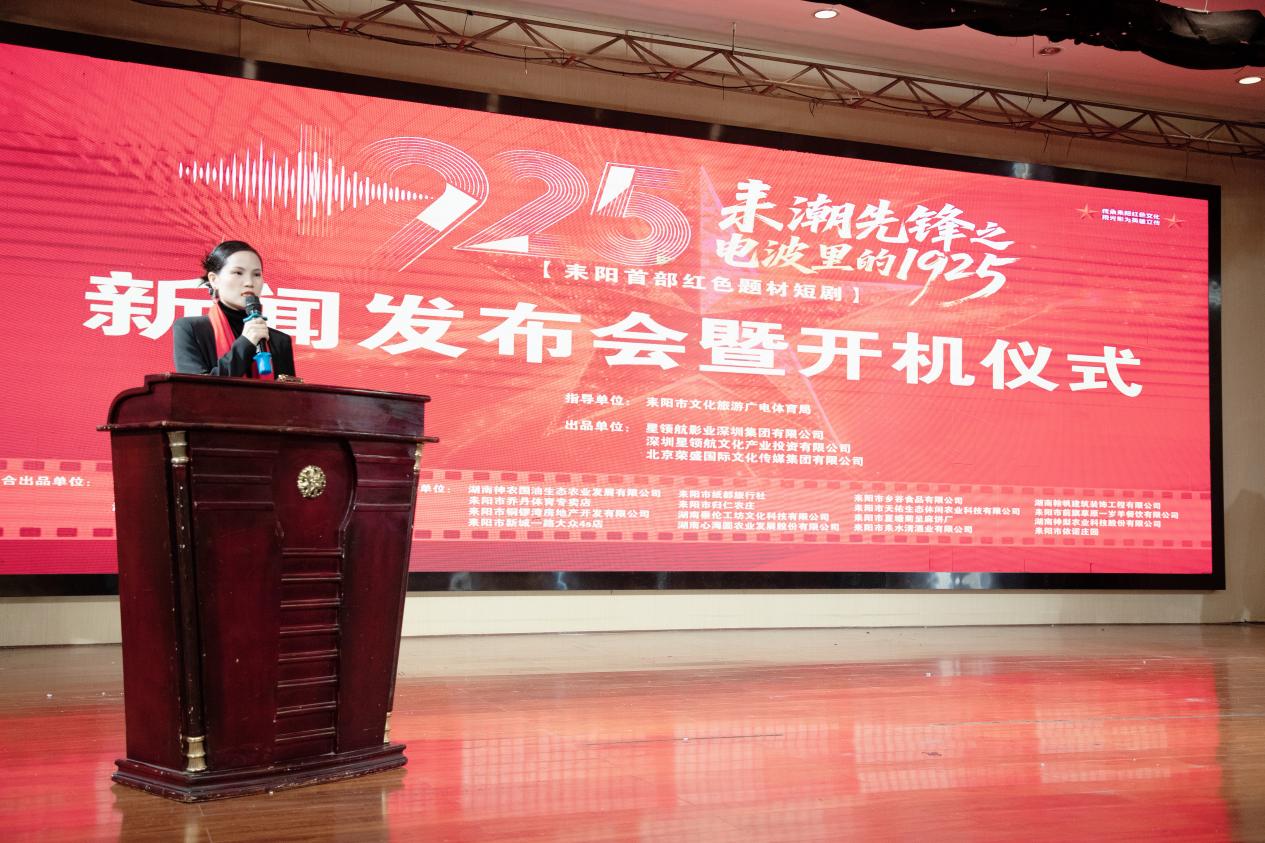 总出品人 、总制片人唐荣霞在致辞中表示,耒阳是一片有着光荣革命传统的红色热土,红色资源丰富、红色底蕴深厚。《耒潮先锋之电波里的1925》以本土革命英烈李汉藩为原型,以跨时空、年轻化、影视化的创新方式讲述红色故事、传播红色声音,是耒阳深化红色文化传承、推动文艺精品创作的又一重要成果。