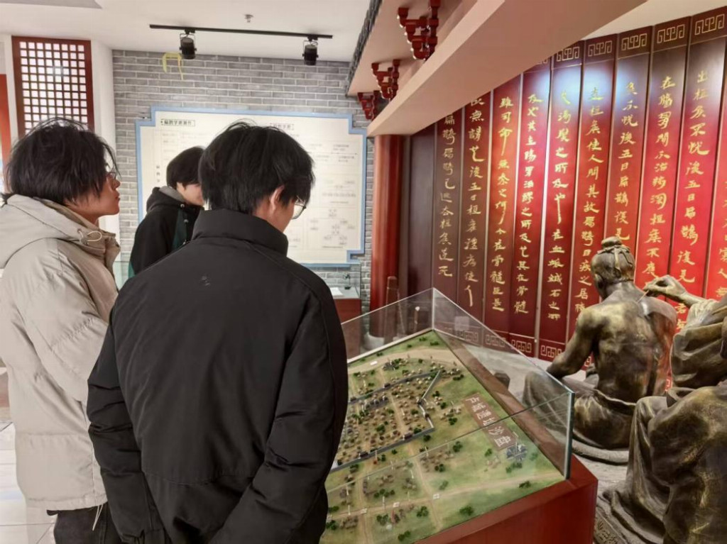 队员在红医博物馆展厅前观摩诊室复原与沙盘模型,聆听讲解并记录要点