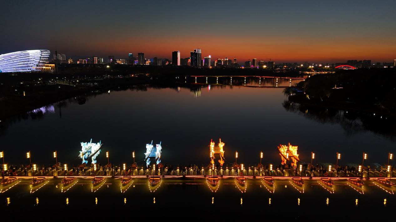 场景营造巧思独具,让古城处处是风景、步步有文化。以“万福归婺・有 FU 之州”为主题的氛围布置,兼顾含蓄内敛与热烈喜庆,保宁门的龙灯、城墙上的门神、街巷间的红灯笼,与万佛塔的璀璨夜景交相辉映,勾勒出流光溢彩的古城画卷;金华浮桥一侧的8条龙舟龙灯,呼应“八婺大地”的地域文脉,10米长龙昂首挺立、灯影流转,既彰显了传统民俗的磅礴气势,更承载着“八婺聚心 古城纳新”的美好寓意,让每一处节点都成为文化传播的载体,让新春氛围与古城肌理深度契合。