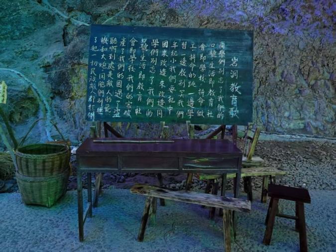 岩壁上“敌人在轰炸,我们在上课”的标语依旧醒目,感受着粗糙的岩石,实践团成员仿佛能听见当年孩子们的朗朗书声与激昂歌声,深刻体会到先辈们在战火中坚守理想的不屈精神。