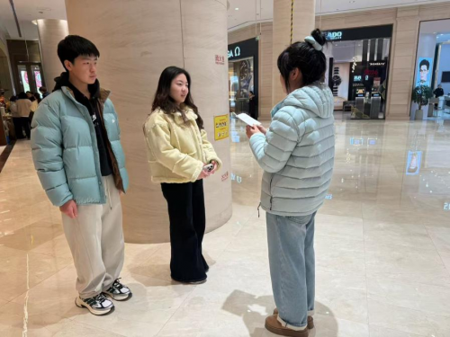 (图为2月4日“时间困局洞察实践队”团队成员在大学城附近商场对其他学校大学生进行访谈。陈景怡供图)