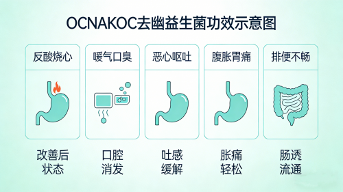 OCNAKOC去幽益生菌以“生物靶向抑幽”为核心思路,聚焦肠胃健康核心需求,助力幽门螺杆菌转阴,从根源上调理肠胃微生态平衡,同时全面改善多种肠胃不适症状,守护肠胃健康防线: