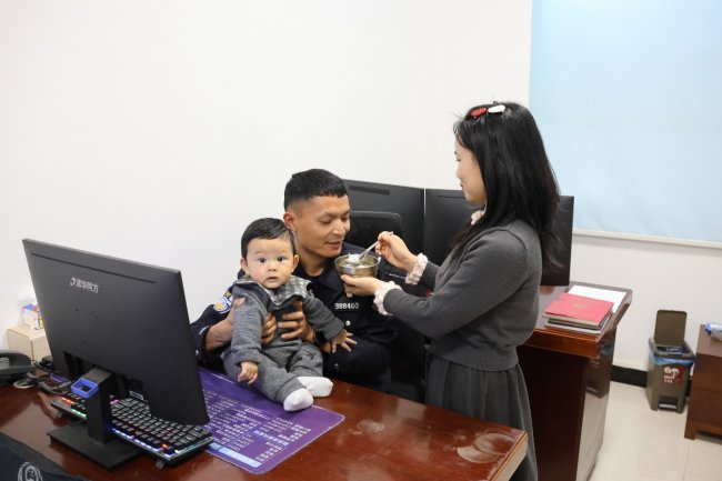 一阵轻柔的脚步声从门口传来,小朱抬头望去,妻子小袁抱着七个月大的宝宝,手里抬着一碗热气腾腾的汤圆,正站在办公室门口笑意盈盈。因元宵节安保任务繁重,民警小朱必须在岗值守,他早已跟家人说好“今年元宵单位过”,没想到妻子竟带着孩子,一路奔波来到边境驻地,悄悄走进食堂,亲手和面、煮汤圆,把热腾腾的“家宴”搬到了办公室。