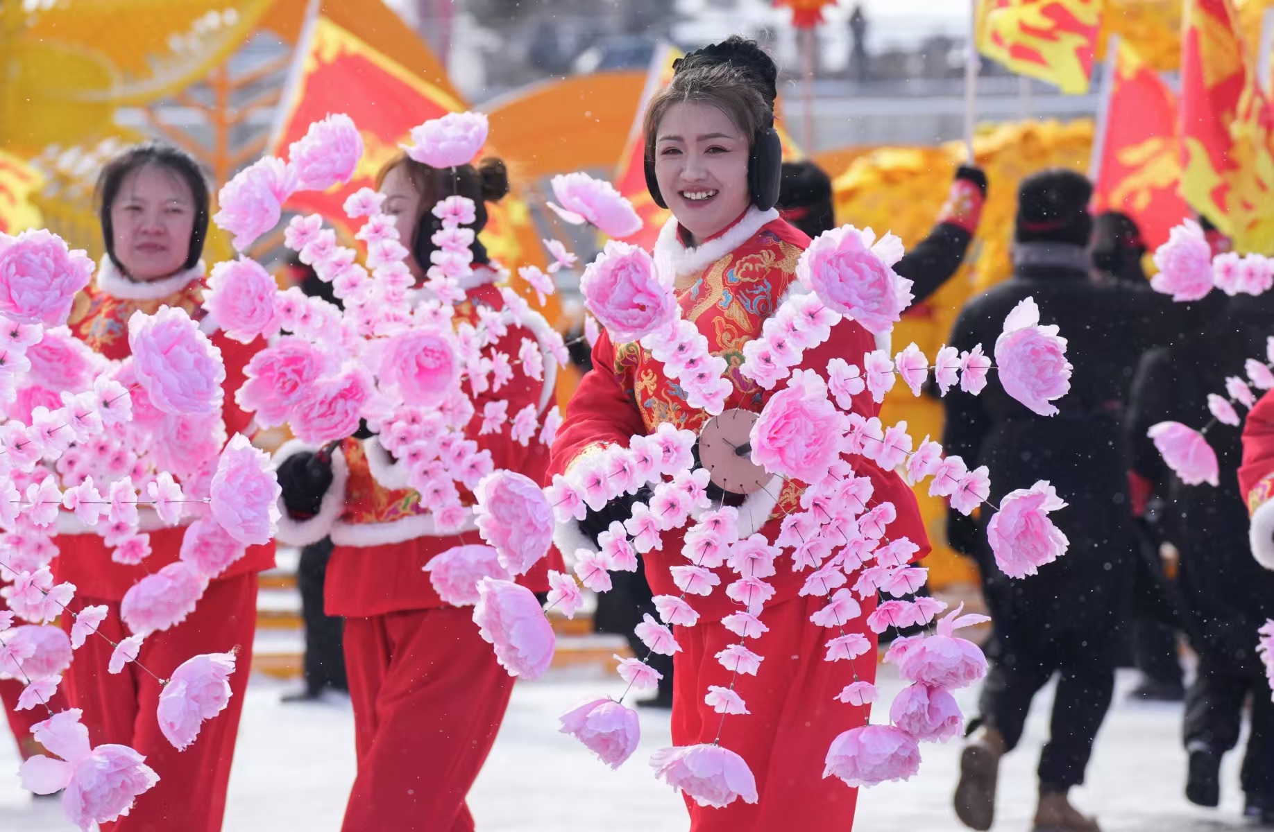 紧随马队其后,15个特色方阵依次亮相。威风锣鼓气势雄浑,扇子花伞、旱船舞龙精彩纷呈,机器狗方队科技感十足,学校武术、轮滑队伍青春动感,年味、边关风情与时代活力交相辉映。