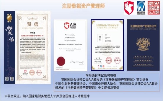 英国国际会计师公会AIA、中国企业财务管理协会、中国职业经理人协会三方本着共同为中国培养全球数字技术与财务专业深度融合的国际化高端会计人才,签署了“注册数据资产管理师”(Certified Data Asset Manager)知识体系合作协议,三方共同在中国境内推动培养国际数字化财务管理与会计人才,开展“注册数据资产管理师”联合认证工作。