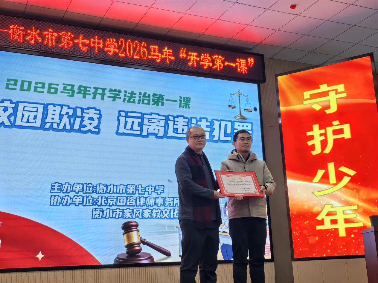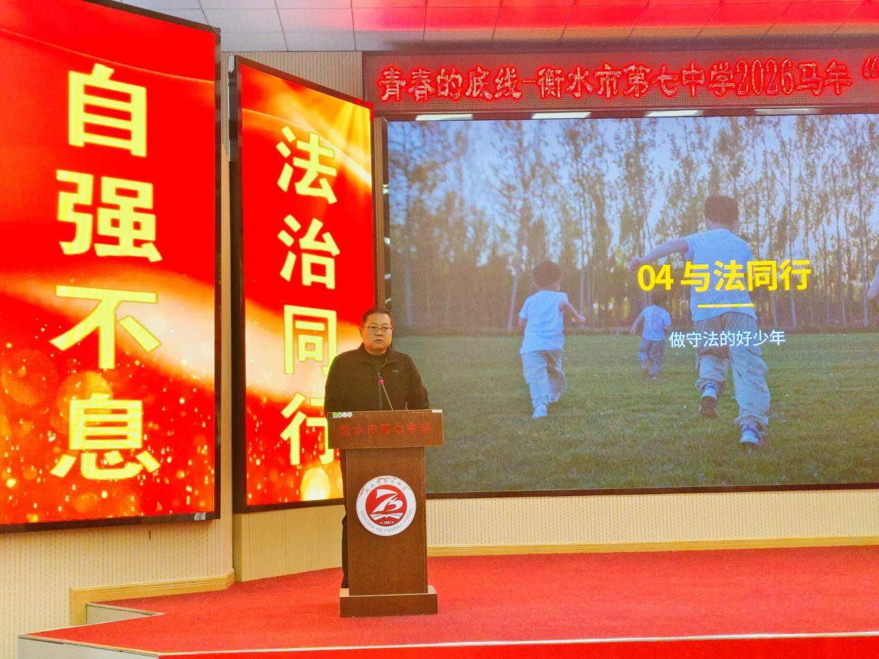 2026年3月5日,河北省衡水市第七中学迎来新学期“开学第一课”。学校特邀知名法学研究、法治文化传播专家曹保印教授,以“抵制校园欺凌,远离违法犯罪”为主题,为全校师生带来一堂深刻、生动、形象、极具教育意义的法治专题课。此次“开学第一课”以网络直播形式,面向学校本部、西校区4385名学生,同步开展开学法治第一课,让法治阳光照亮校园每一个角落。