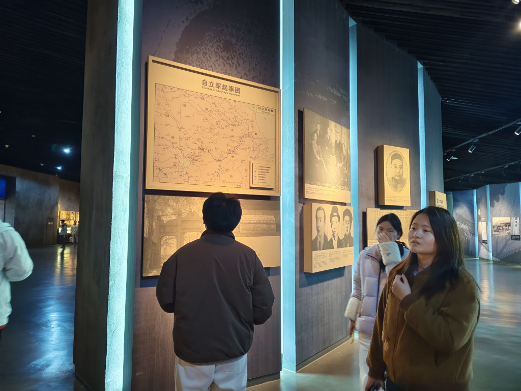 步入辛亥革命博物馆,庄严厚重的历史气息扑面而来。在讲解员的引导下,同学们依次穿梭于“晚清中国”“革命原起”“武昌首义”“创建共和”“辛亥百年”五大展区。泛黄的文献手稿、斑驳的历史文物、栩栩如生的场景复原,配合多媒体光影技术,将辛亥革命推翻帝制、开启共和的壮阔史诗娓娓道来。同学们在《辛亥风云》全息影像前驻足凝视,在武昌起义模拟战场中屏息聆听,在革命先驱家书展柜前轻声诵读。一件件展品无声诉说着先辈们为民族觉醒舍生忘死的赤诚,让“天下兴亡,